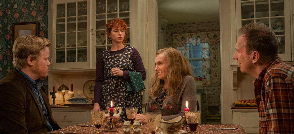Much of the film is made up of extended scenes and moments. Aside from the conversations in the car there are almost real-time scenes around a dinner table or at a roadside ice cream shop. Through this the realism and humanity of the film is brought through, especially the way that it delves into relationships. However, unlike the likes of Anomalisa and Eternal Sunshine Of The Spotless Mind, both of which were penned by Kaufman, there’s a slight horror tone to the film. As things become warped and twisted within the home of Jake’s parents the look into the relationship seems to be put aside for the sake of looking at eerie events within the household, and the behaviour of Thewlis and Collette’s exceptionally performance characters. Not just their off the cuff comments such as “Billy Crystal’s a nancy” or their loud somewhat raspy gasp filled laughs that linger for a while after the joke respectively but their general physicality and appearance that seems to change, evolve and devolve around every corner; as if each new room is in a different time period.
