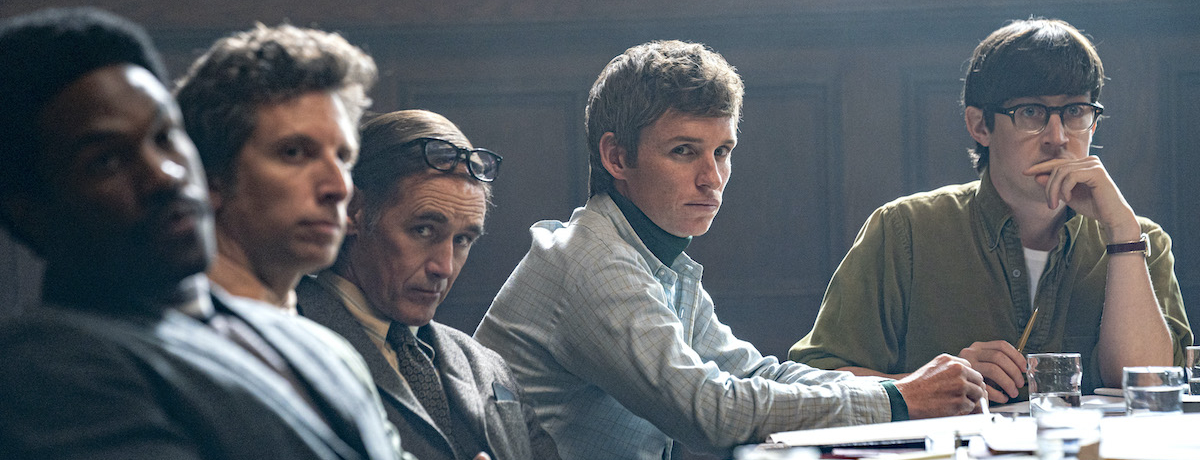 The player’s in Sorkin’s recreation of the trial contain many a famous face, each one giving a stellar performance. A cast that includes the likes of Eddie Redmayne, Sacha Baron Cohen, Yahya Abdul-Mateen II, Mark Rylance, Frank Langella and Joseph Gordon-Levitt; just to name a few. Each one understands their character, where they come from and what they want to represent. While it’s made out that not all of them have met before the trial – particularly Abdul-Mateen as Black Panthers co-founder Bobby Seale; a passionate performance filled with anger and emotion as his figure finds himself discriminated against within the court setting, and by Langella’s unfairly ruling judge.