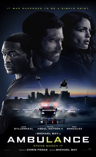 Two brothers (Jake Gyllenhaal, Yahya Abdul-Mateen II) hijack an ambulance, with medic (Eiza González) and shot cop (Jackson White) still inside, when a bank robbery goes wrong, leading to a police chase across LA.