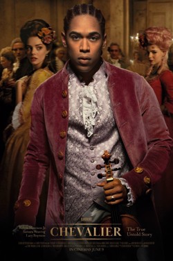 Perhaps it’s down to my ignorance (I used to play percussion and would quite like to know how to play the banjo, and maybe the steel pan drums) but I never knew the violin could be so exciting. Yet, there’s a captivating nature to the musical duel between Chevalier Joseph Bologne (Kelvin Harrison Jr.) and the man he shows up in the middle of a concert, a praised foreigner called Wolfgang Amadeus Mozart (Joseph Prowen). Unknown to Mozart the Chevalier is a highly praised figure in Paris, known for his musical compositions, fencing skills and friendship with Queen Marie Antoinette (Lucy Boynton); and he’s certainly aware of his own talents. So much so that he’s determined to take over as leader of the Paris Opera.