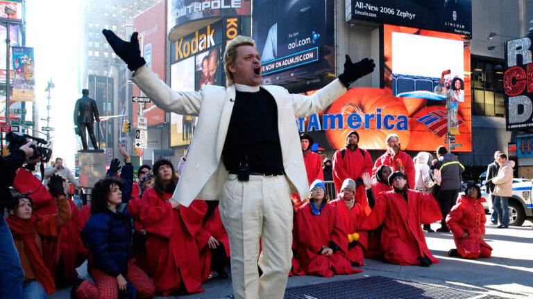 In 1996 Arnold Schwarzenegger took on the biggest fight against the commercialisation of Christmas since Charlie Brown’s. How did he do this? By running all across Minneapolis in a desperate bid to get his son the must-have toy that year before dressing up as the Turbo Man action-figure in a Christmas Eve parade. For Reverend Billy and the Stop Shopping Gospel Choir their fight with the festive season’s increased promotion of consumerism isn’t limited to just Christmas Eve or Minneapolis as What Would Jesus Buy? sees them travel across America preaching their cause through performance protest.