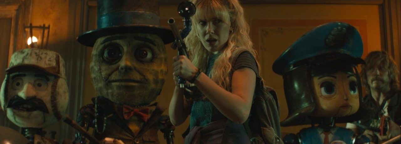 Michelle’s reasoning for entering the exclusion zone relates to a robot which arrives at her home, claiming to contain the consciousness of her late younger brother (Woody Norman), although only able to speak in catchphrases from an old cartoon. In order to find out what’s happening she must track down robot leader Mr Peanut (yes, the American brand mascot – voiced here by Woody Harrelson), who was at the fore of the fight, and resolution, of the war between humans and robots when worker bots began to demand more rights. And thus we have an alternate 90s landscape full of futuristic technology, as if looking at the past’s view of the future.